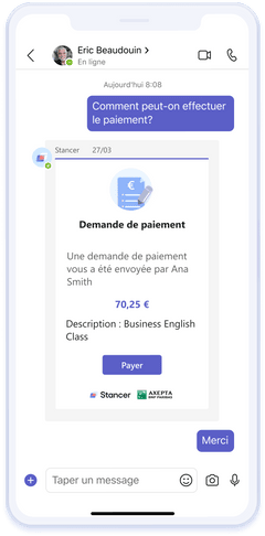 Avec Stancer, chaque conversation Microsoft Teams devient une opportunité de paiement, garantissant une expérience d’achat transparente et sécurisée pour vous et vos clients.