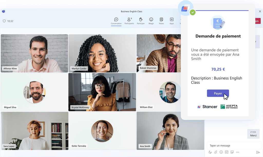 Découvrez une nouvelle manière simplifiée et sécurisée de gérer vos transactions en ligne directement depuis Microsoft Teams avec Stancer. Notre application officielle vous permet d'accepter les paiements lors de vos rendez-vous, cours ou événements virtuels en toute fluidité.